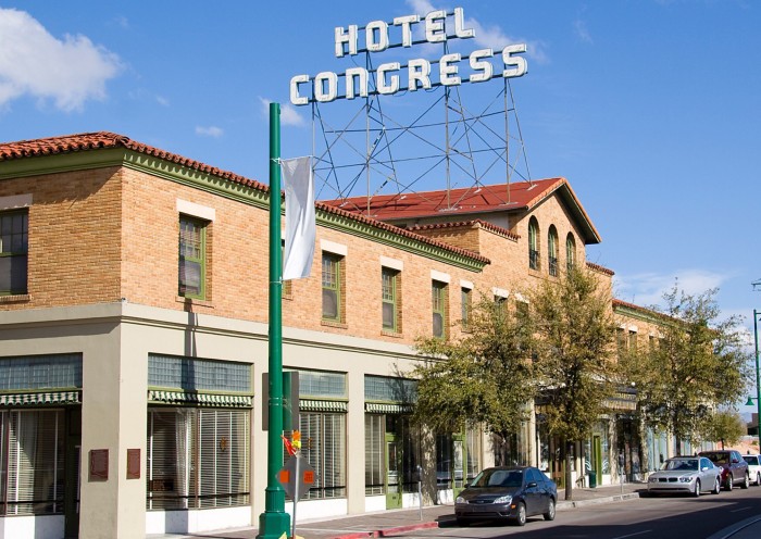 "Built in 1918, the original "Congress Hotel" was heralded in the local paper at the time as the southwest’s first "flatiron" hotel, owing to the triangular shape of the building and the plot of land upon which it sits. The railroad adjacent hotel aimed to serve the expanding number of passengers heading west on the then Southern Pacific line.